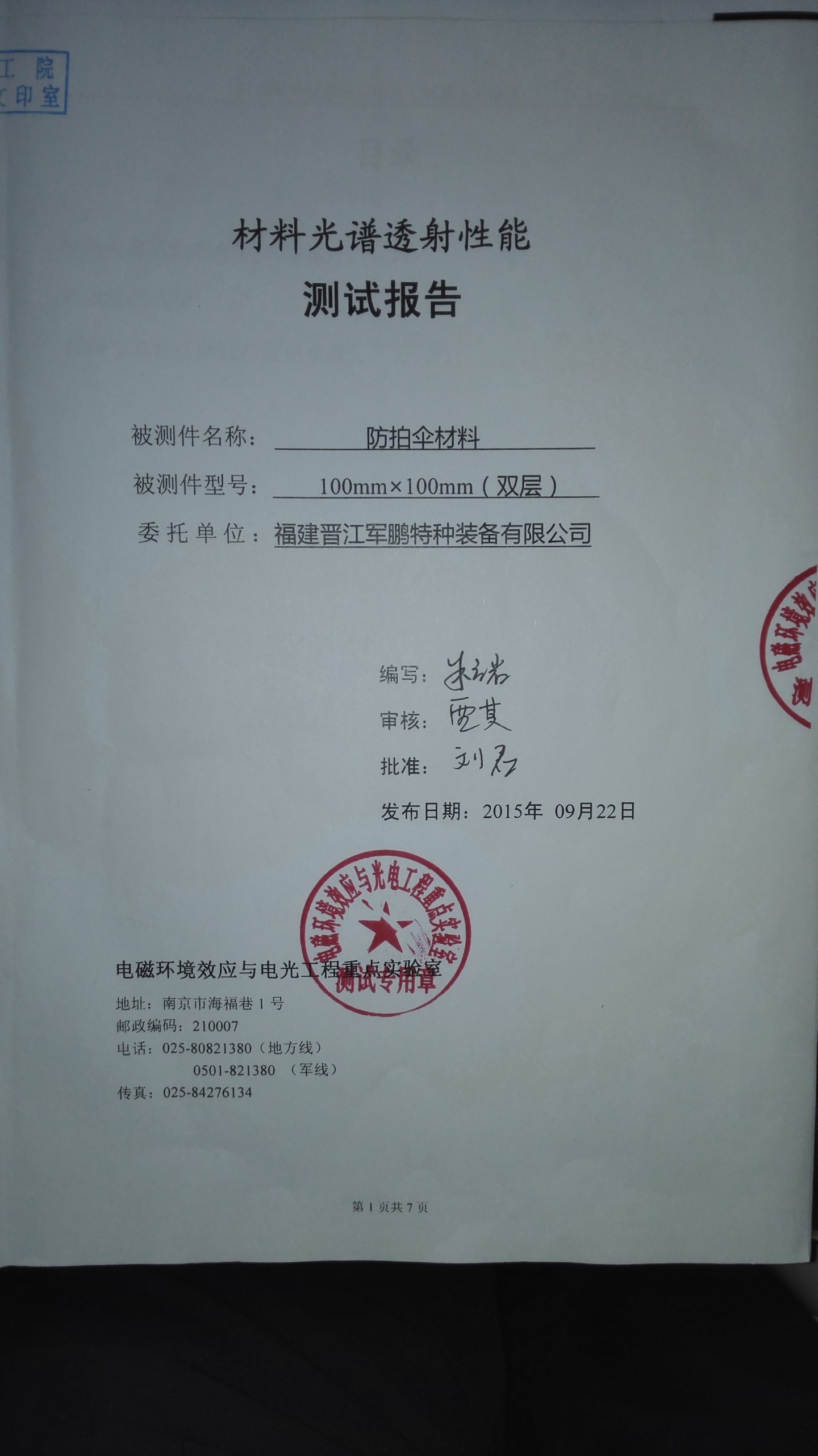 4、便攜式防拍照傘面材料為雙層復(fù)合材料。外層為防光學(xué)成像多元素涂層材料、里層為100%銀纖維導(dǎo)電復(fù)合織物。