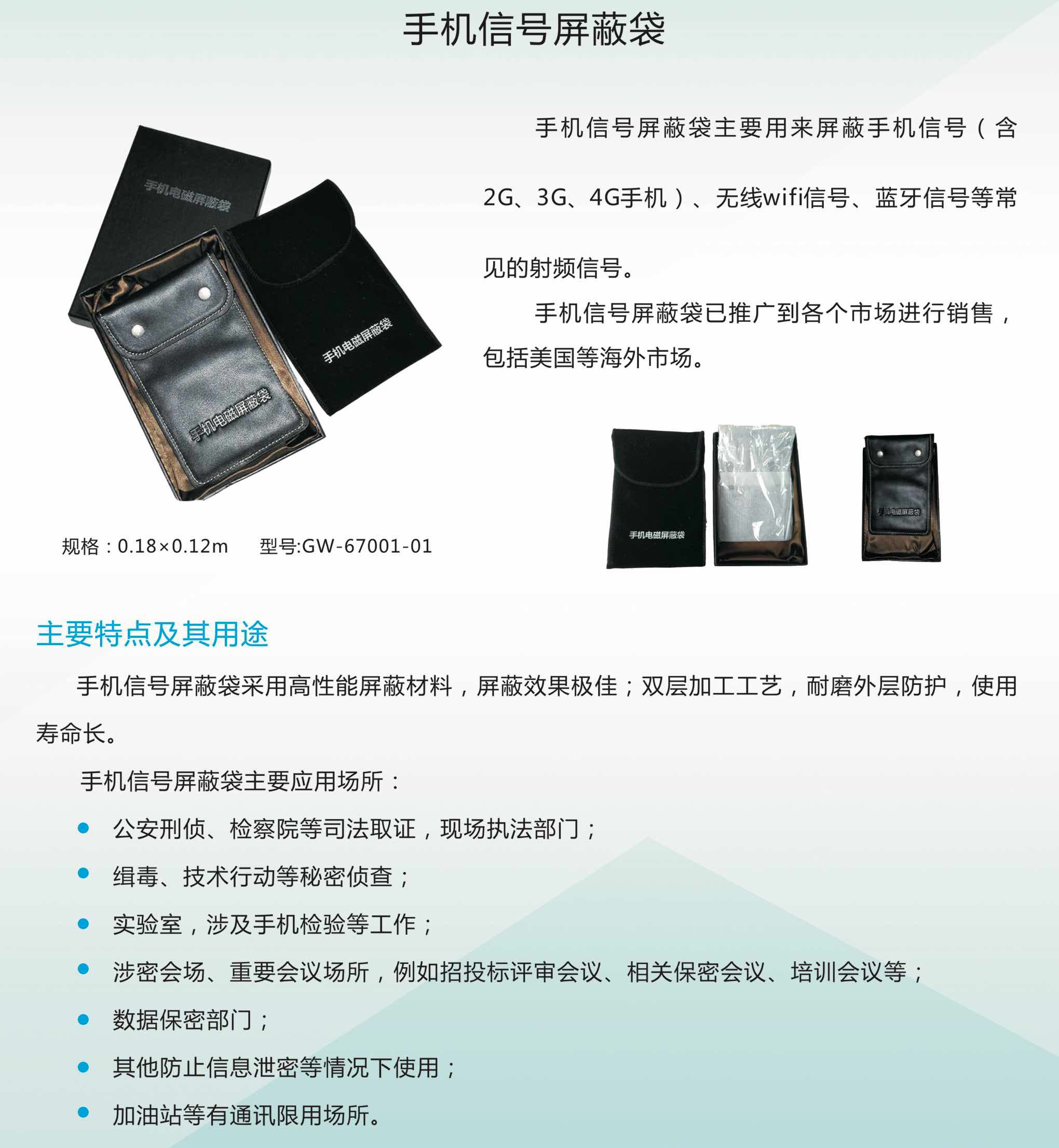 功能:能夠屏蔽所有的來電信號,產品應用范圍較廣,可以在任何不愿接電話或不能接電話的場合下使用,可以免遭打擾,不會被跟蹤定位。